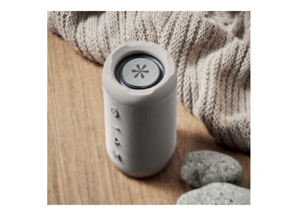 5.0 głośnik bezprzewodowy z ABS z tkaniną RPET. 1 akumulator Li-ION 800 mAh w zestawie. Zawiera port karty SD i kabel AUX/USB. Dane wyjściowe: 5W, 3 Ohm i 5V. Czas odtwarzania ok. 3 godz.