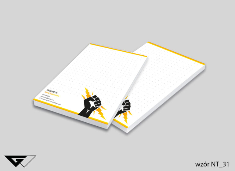 Notes firmowy dla Elektryka – energiczna Jak zamówić notes: 1. Wybierz format 2. Wybierz ilość 3. Wybierz gotowy wzór, nie musi to być notes może to być np. wizytówka, na jej bazie wykonamy notes. Naniesiemy Twoje dane i wyślemy projekt do akceptacji.