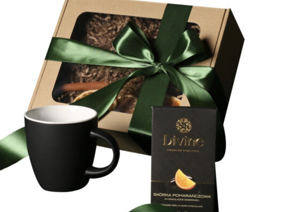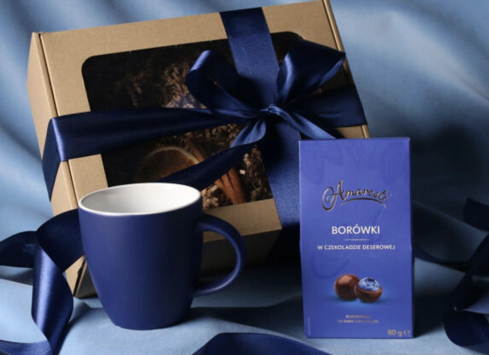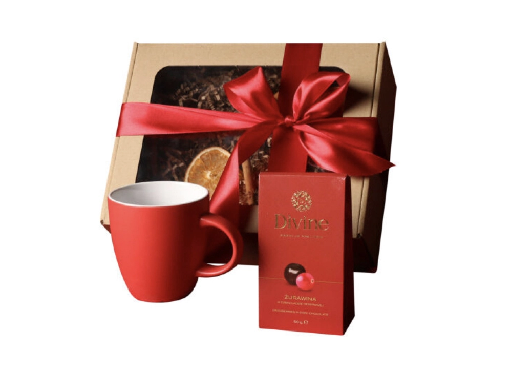 kubek Fiord czerwono-biały / granatowy-biały / czarny-biały z możliwością zdobienia, Divine Pralines – żurawina w czekoladzie (czerwony) / borówki w czekoladzie (granatowy) / skórka pomarańczy w czekoladzie (czarny)