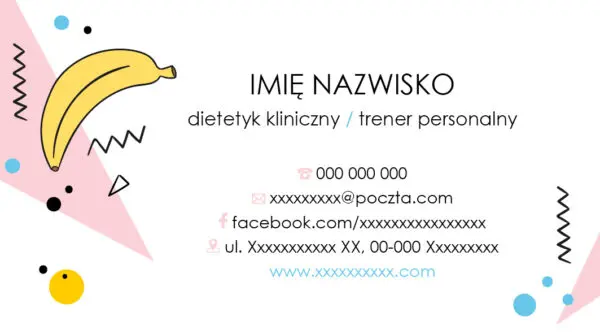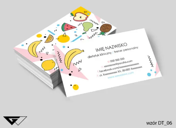 Pogodna, kolorowa oraz owocowa wizytówka (90 x 50 mm) dla dietetyka. Jak zamówić wydruk: 1. Wybierz ilość 2. Wybierz rodzaj Nie wiesz jaki rodzaj wizytówki wybrać zajrzyj do naszego poradnika W naszym sklepie możesz kupić projekt do druku. Wybierz w ilości „projekt do druku” i otrzymaj gotowy projekt z twoimi danymi w pdf.