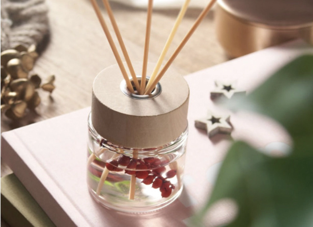 Dyfuzor zapachowy z 6 trzcinowymi patyczkami. Zapach: wanilia. Pojemność: 100 ml. Twoje logo umiescimy na zawieszce dyfuzorze